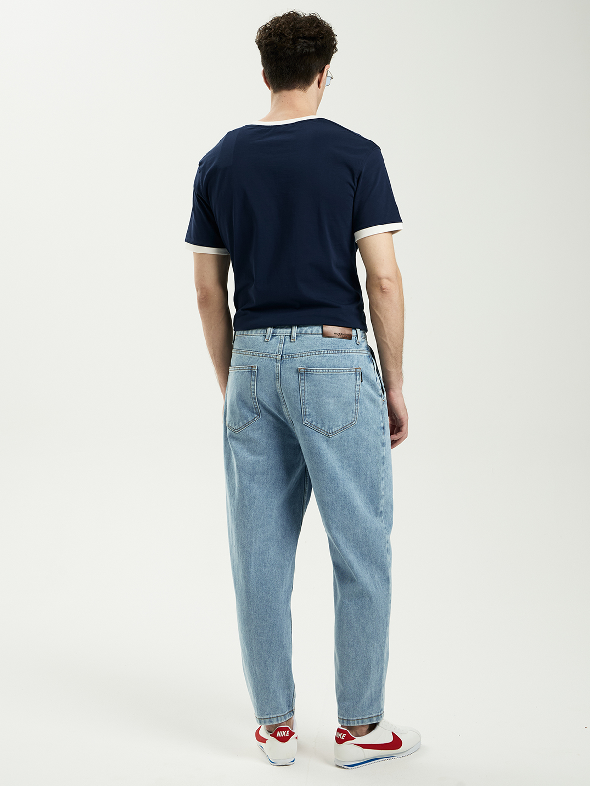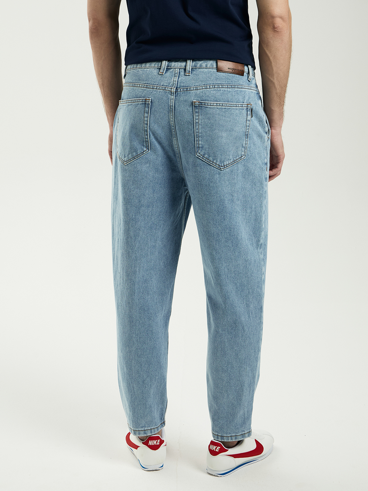 Мужские джинсы силуэта мом из 100% хлопкового денима на рост 172-178 см. Эти джинсы отличаются свободным кроем на бедрах и эффектными защипами на талии, что обеспечивает непревзойдённый комфорт и стильный силуэт МОМ. Модель выполнена из 100% хлопка, который дает отличную воздухопроницаемость и мягкость ткани. Мы знаем, как важен комфорт в повседневной жизни, поэтому наши джинсы легко носить весь день, не испытывая дискомфорта. Четыре практичных кармана и шлевки на талии добавляют функциональности и удобства. Нейтральный голубой оттенок идеально подходит для создания базового гардероба, а контрастная строчка добавляет динамики в силуэт джинс и внимание к деталям. Эти джинсы MOM с лёгкостью станут ярким акцентом в вашем гардеробе. Детали: силуэт МОМ, контрастная строчка, четыре кармана, защипы на талии.